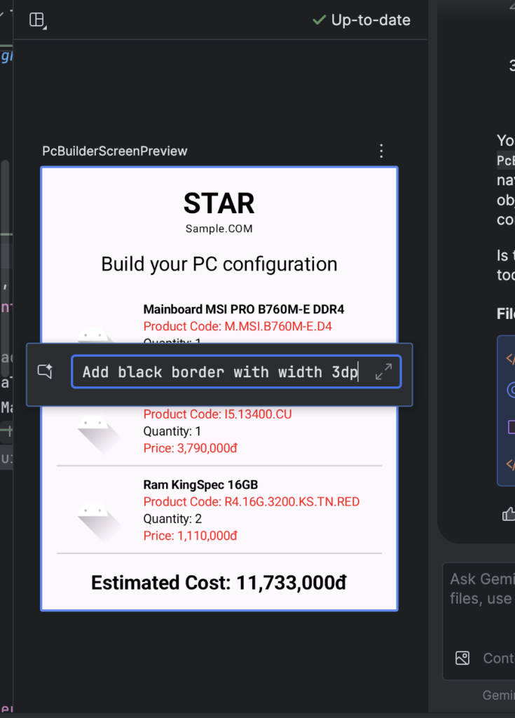 Another standout capability is the assistant’s ability to transform design mock-ups directly into production-ready UI code. Developers can simply upload screenshots, wireframes, or full design mock-ups and let the assistant interpret layout structures, component hierarchies, spacing, typography, and colors. Combined with text-based instructions, Gemini can translate both visual and textual cues into clean XML layouts or Jetpack Compose code that fits naturally into the project.