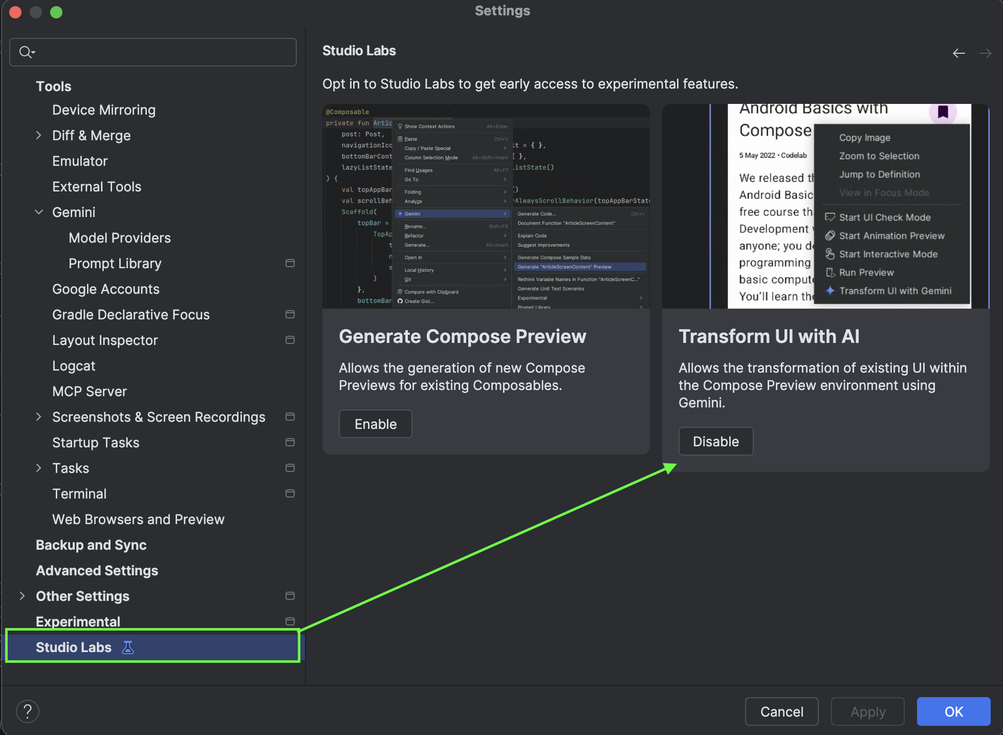 This capability builds on a Studio Labs feature introduced in early 2025 with Android Studio Narwhal (2025.1.1). For the first time, developers can modify or generate Jetpack Compose UI directly from natural-language prompts inside the Compose Preview itself. Instead of manually adjusting composables or tweaking layout parameters, you can simply describe what you want—“make the card rounded,” “add a search bar at the top,” or “convert this layout to a responsive column”—and the assistant updates the preview accordingly.