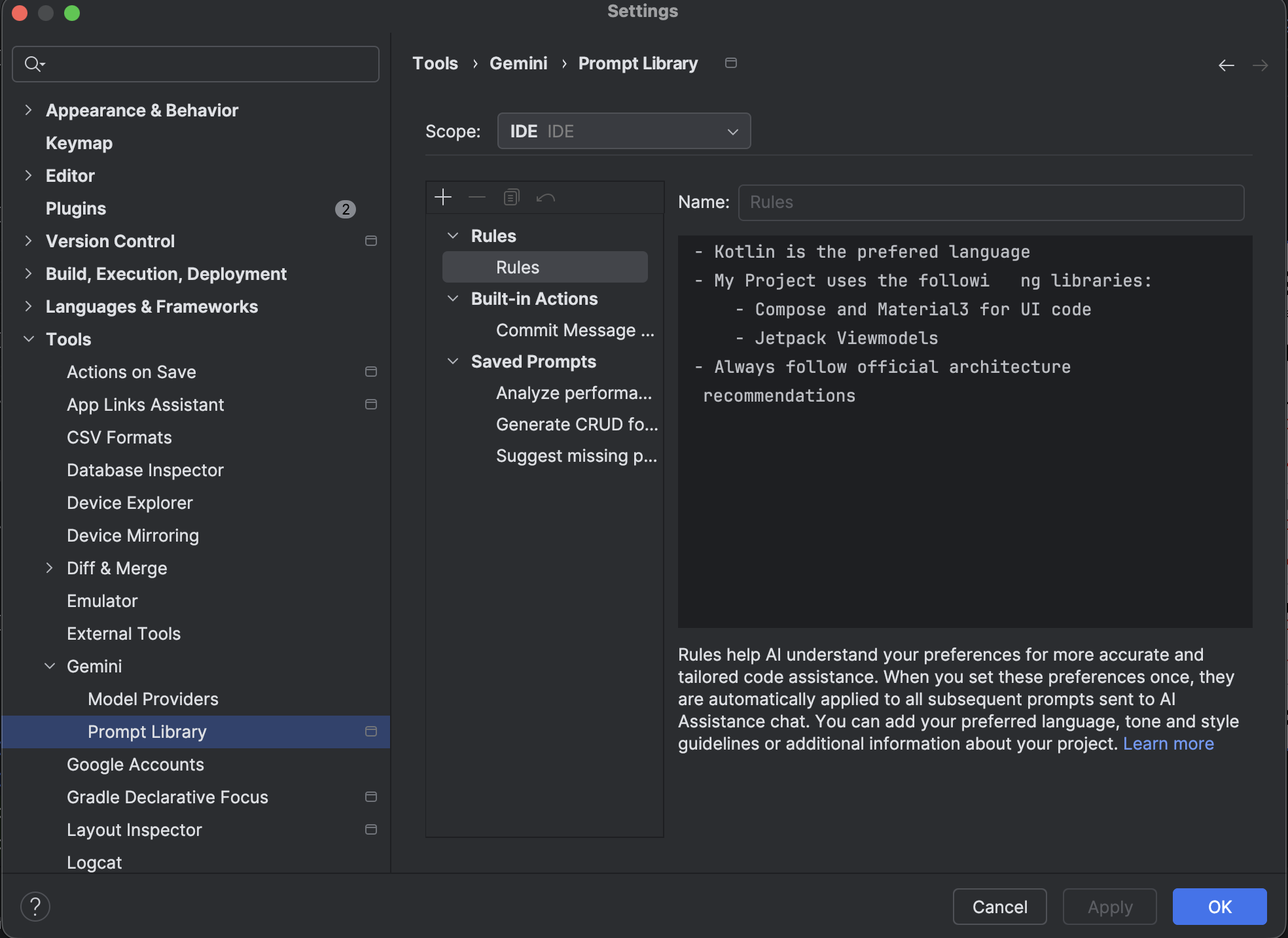 When creating rules, aim for clear, actionable instructions—such as “Always provide code examples in Kotlin,” “Use Material 3 components for UI,” or “Follow company naming conventions.” These rules help the assistant generate more relevant, consistent output. Once everything is configured, simply click Apply or OK to save your rule set and put it into effect.