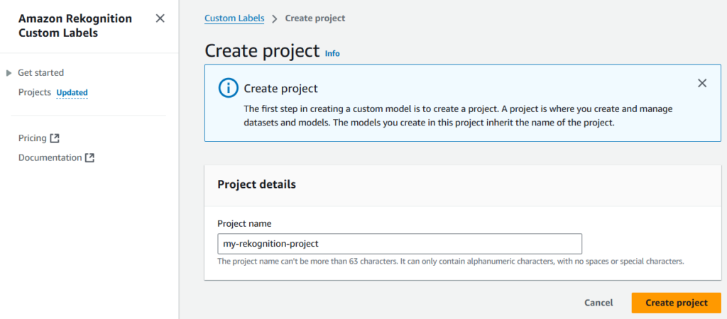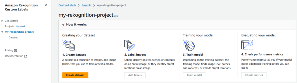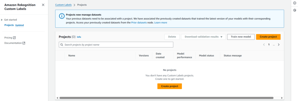 First step is to create a project under which the model will be placed. For that we need to navigate to Projects section (on the left-side panel) of Amazon Rekognition’s Custom Labels.