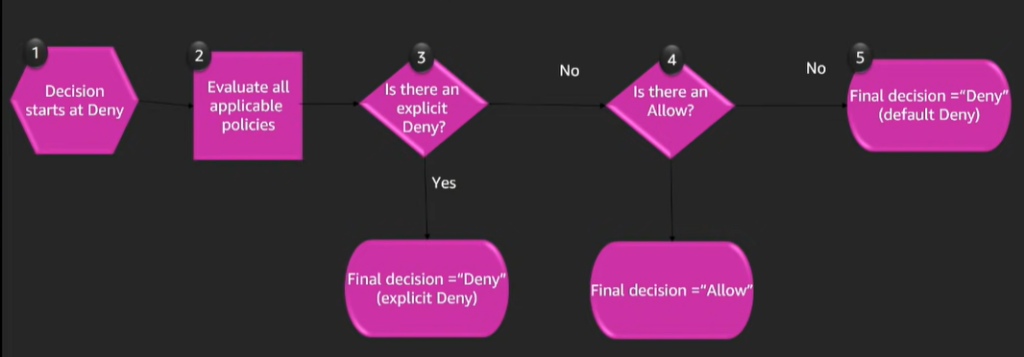- The evaluation always starts with an implicit Deny, this is because everything in AWS is denied by default.