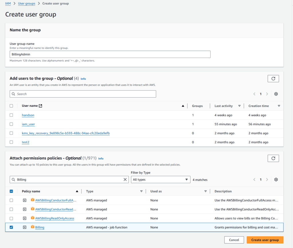 Next, enter the group name as [BillingAdmin] and choose the existing [Billing] permission policy to attach the permissions policy to the group.