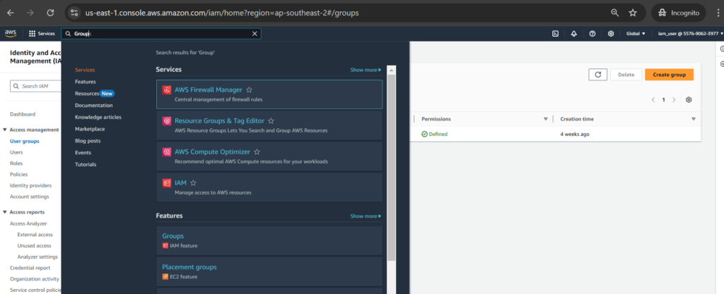 By typing [Group] in the Search bar to go to IAM > User groups, then click [Create group] button