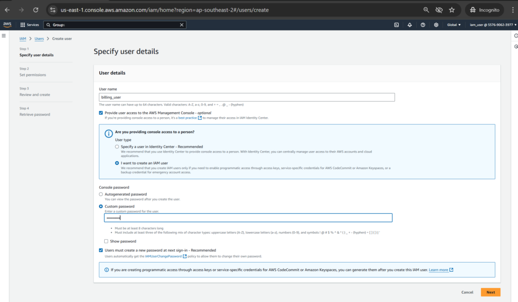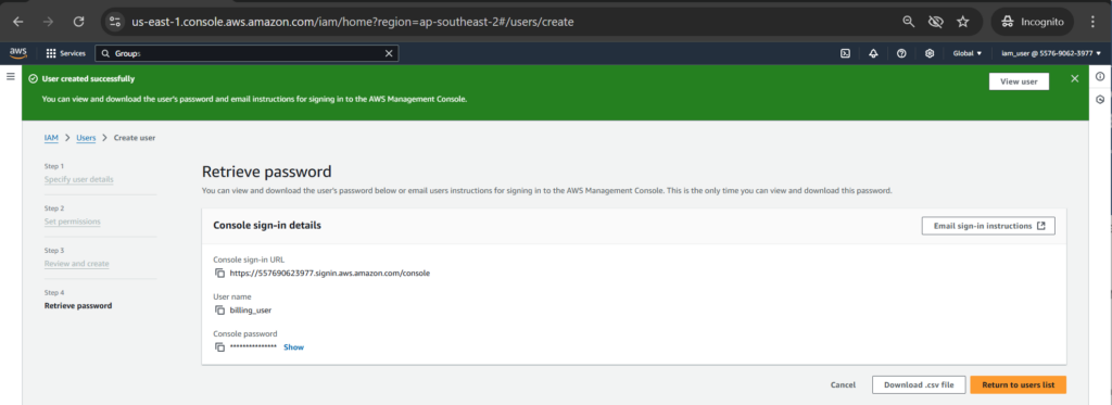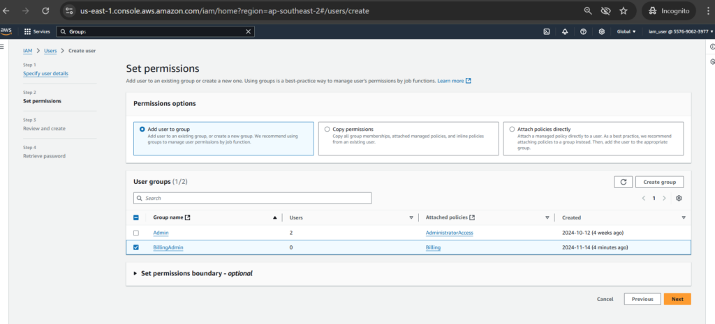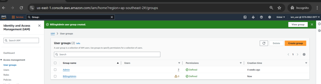 Role-Based Access Control (RBAC) in AWS Identity and Access Management (IAM) is a powerful strategy for managing permissions based on job functions or roles. We will use the billing managed policy attached to a group. After that assigning a user to that group to regulate the billing permissions of the user by the group’s policy.