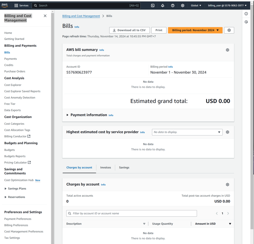 Next, let’s type [Billing] in the Search bar to go to [Billing and Cost Management]. Now the [billing_user] can view Bills information