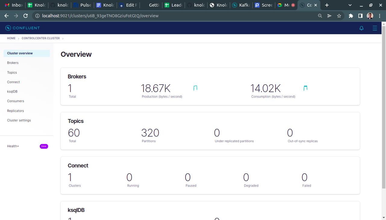Now go to the browser and open the control center URL by running localhost 9021/. It will open the control center and our services are running successfully.
