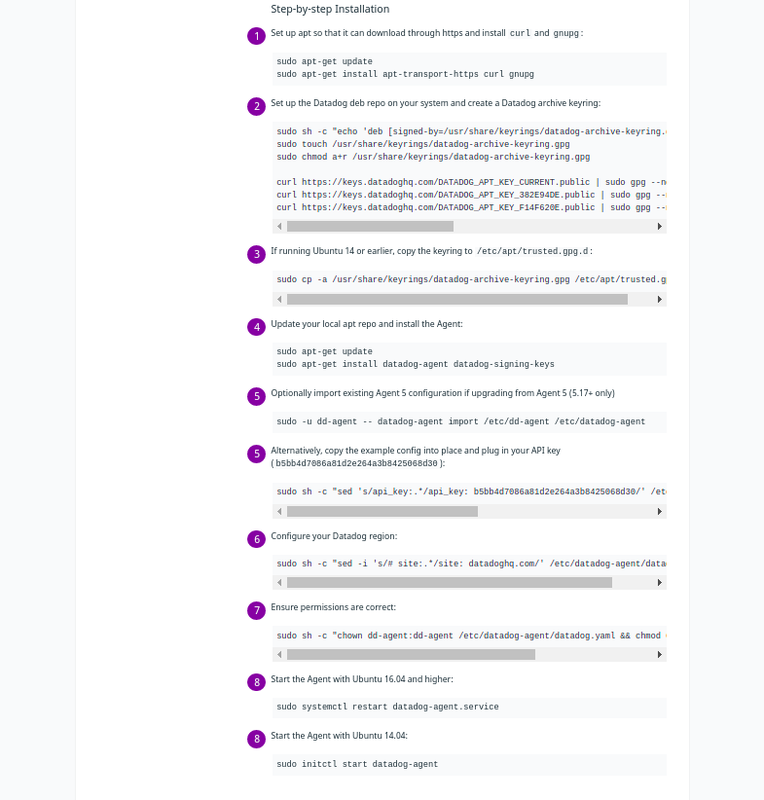 If you want to install agent step-by-step you can try this and you can find these steps under UBUNTU supported list, as all these steps are changed for every agent.