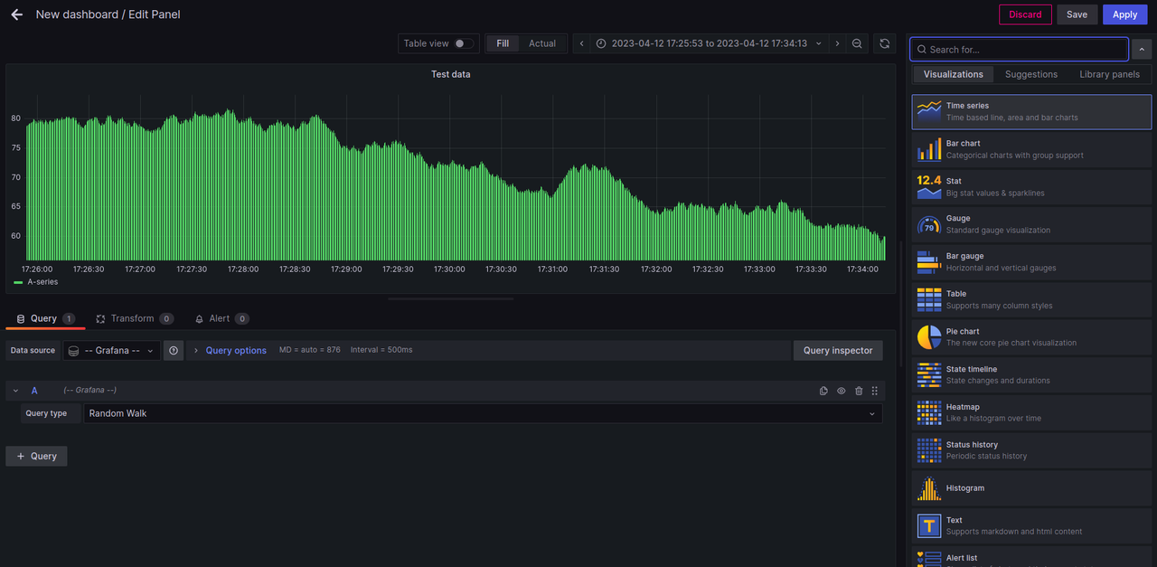 - Choose a visualization type for your dashboard, such as “Graph” or “Singlestat.”