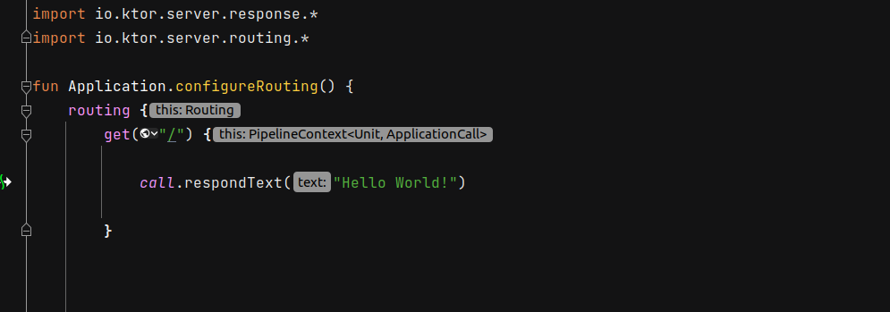 Now, let’s define our application routes. In the routes directory, create a new Kotlin file named HelloRoutes.kt. Add the following code to define a simple route that returns a greeting: