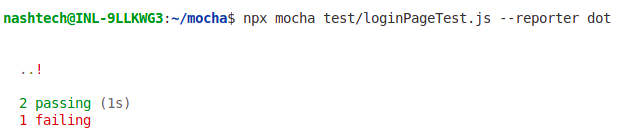 - Dot Matrix – The dot matrix reporter uses a series of characters to represent test cases: failures are marked with red exclamation marks (!), pending tests with blue commas (,), and slow tests are highlighted in yellow.