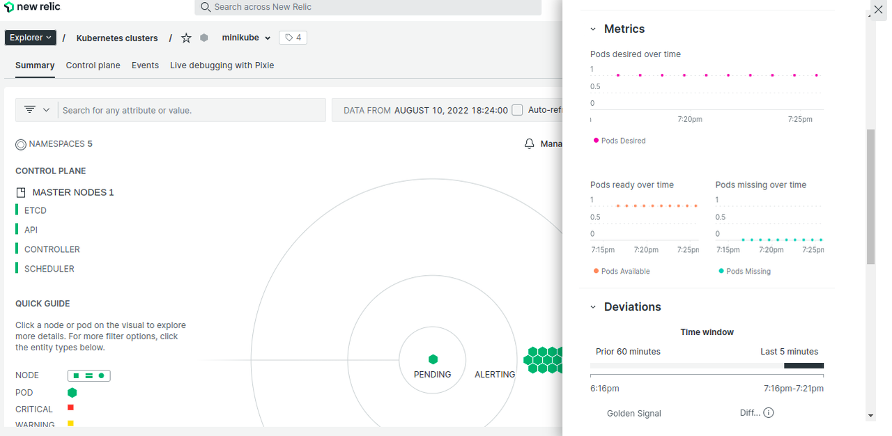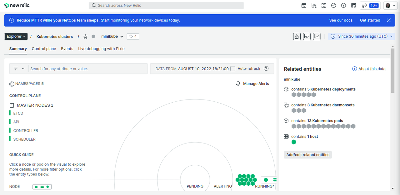 The Kubernetes integration in New Relic provides full visibility into the health and performance of your environment, whether you run Kubernetes on-premises or in the cloud. With the help of the cluster explorer, you can observe how your cluster is operating at all levels of complexity, from the heights of the control plane down to the level of individual applications running on a single pod.