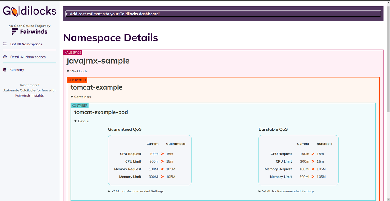As you can see the requests and limits recommendations for the example javajmx workload. The current column under each Quality of Service (QoS) shows the CPU and memory request and limits set at the time. The Guaranteed and Burstable columns under each QoS show the recommended CPU and memory request limits for the respective QoS.