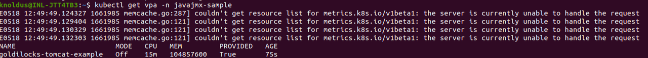As mentioned earlier, This will be creating VPAs for each deployment in a enabled namespace. Using the kubectl command, we can verify that a VPA was created in the namespace for the goldilocks-tomcat-example: