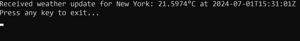 Console.WriteLine($"Received weather update for {response.City}: {response.Temperature}°C at {response.Timestamp}");