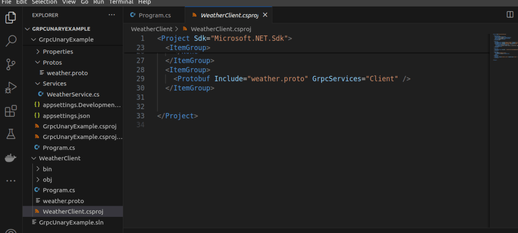 Copy the weather.proto file from the server project to the client project and add the following ItemGroup to the client’s .csproj file:
