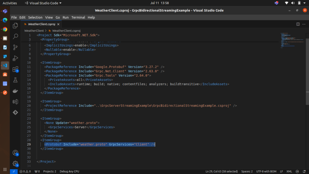 Create a new console application project within the same solution named WeatherClient. Add a reference to the gRPC service project and the necessary NuGet packages: