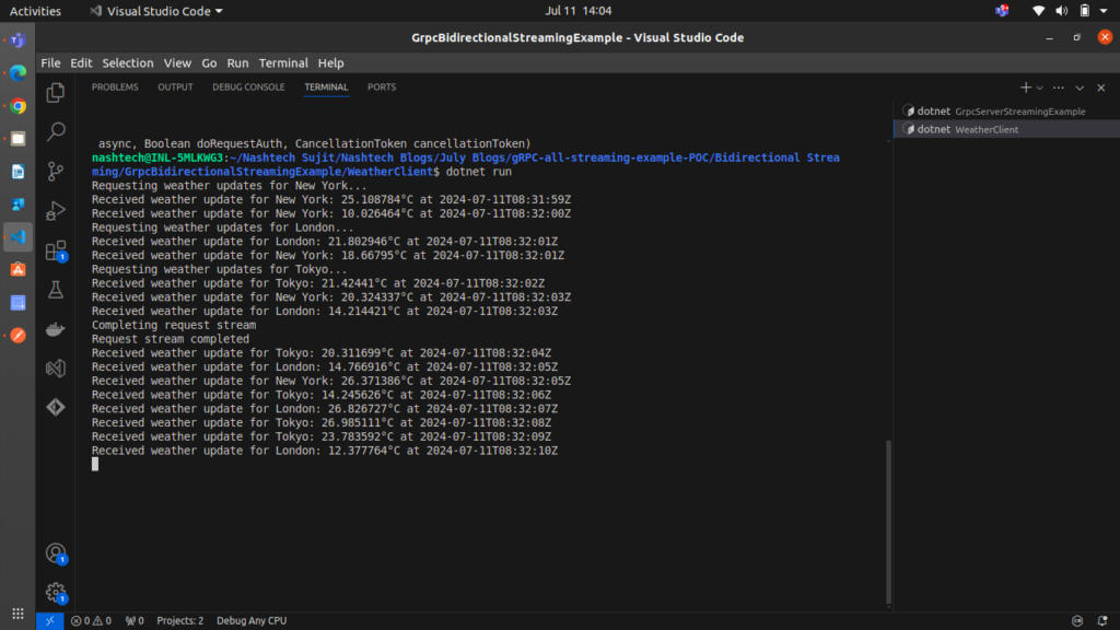 In the client-side implementation, we create a WeatherClient and initiate a bidirectional streaming call using GetWeatherUpdates. We then send a series of WeatherRequest messages and asynchronously read the responses from the server.