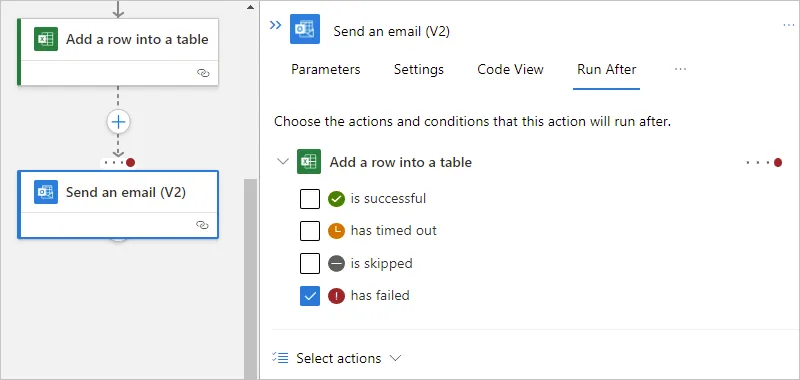 An action is recorded as Failed when it throws an unhandled error, and any dependent actions are marked as Skipped. By default, the “run after” status is set to “is successful,” meaning the predecessor action must complete successfully before the currently selected action can run.