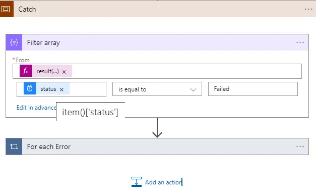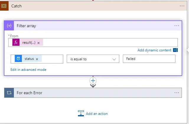 - Add Filter Array: After the Catch Scope, add the Filter Array action.