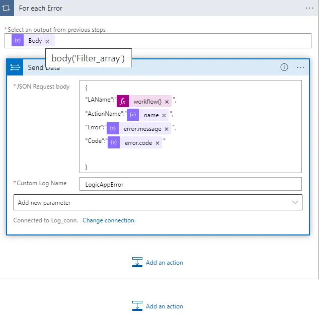 Add an HTTP Action in the Catch Scope to send error messages to Log Analytics.
