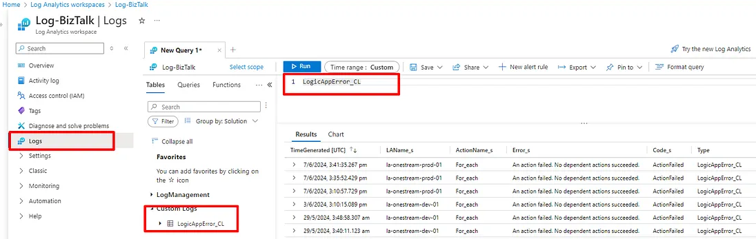 Once you’ve sent error logs to Log Analytics, you can query them using Kusto Query Language (KQL). This allows you to generate insights and trends over time.