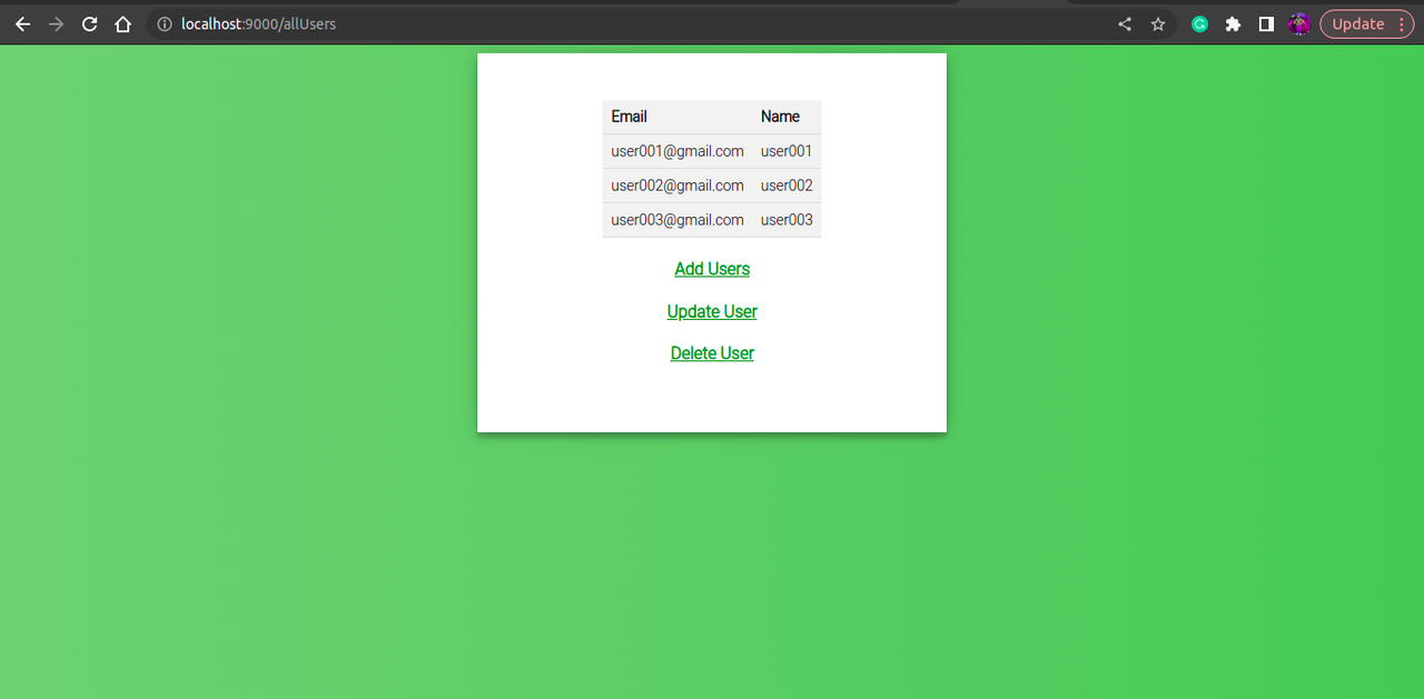 You will see all users on the next page. if you want to try the Update and Delete operation just press the button and enter the details
