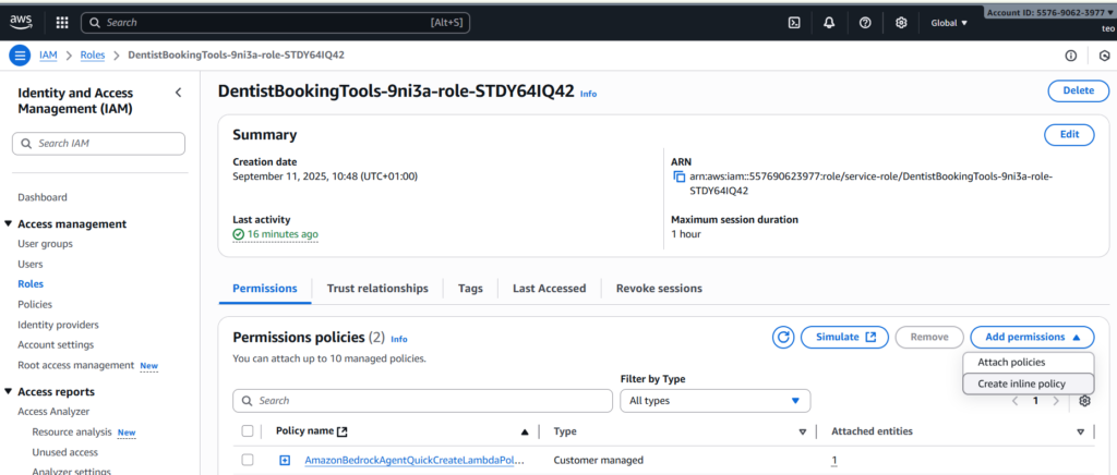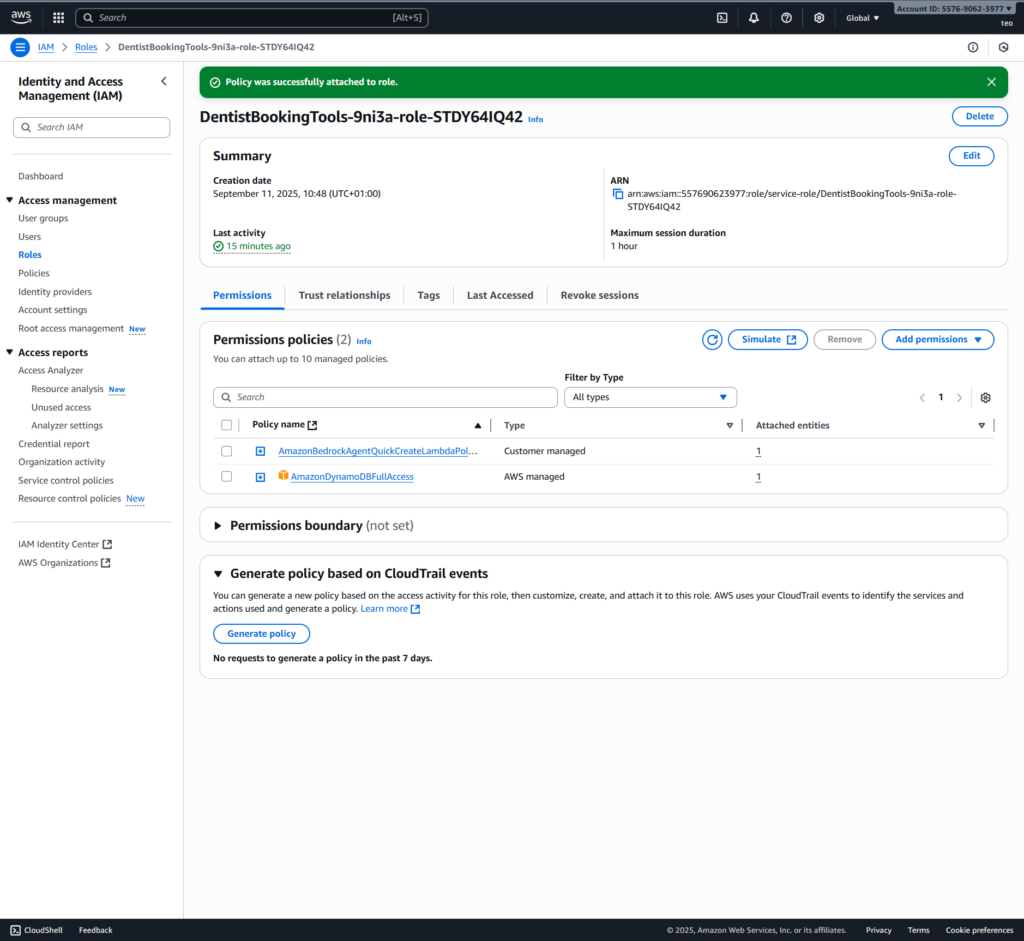 • Update the role attached to the lamba function (called DentistBookingTools-9ni3a-role-STDY64IQ42): to have the permissions that querying/updating our Dynamo tables.