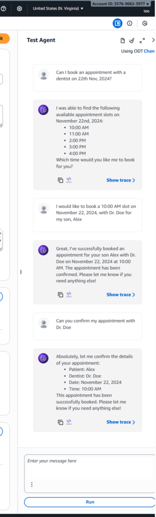 • Goal: The agent should attempt to call the /bookAppointment endpoint. However, since the appointments.json file already has an appointment for this time, the conditional write in the Lambda function should fail. The agent should report back that the slot is no longer available.