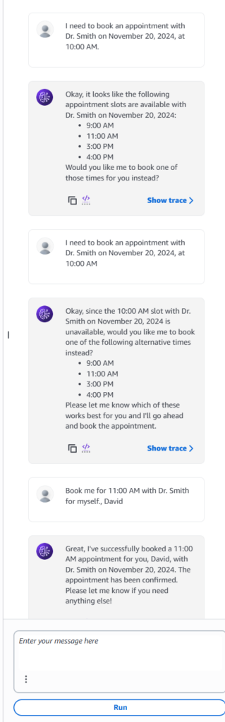 • Goal: The agent should successfully call the /bookAppointment endpoint for the 11:00 AM slot. The conditional write will succeed this time, and the agent should provide a confirmation message to the user.