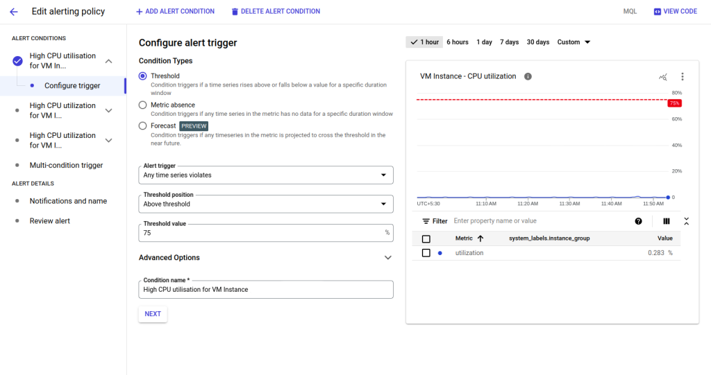 - In the Condition Name field, enter High CPU utilisation for VM Instance (name_of_vm)