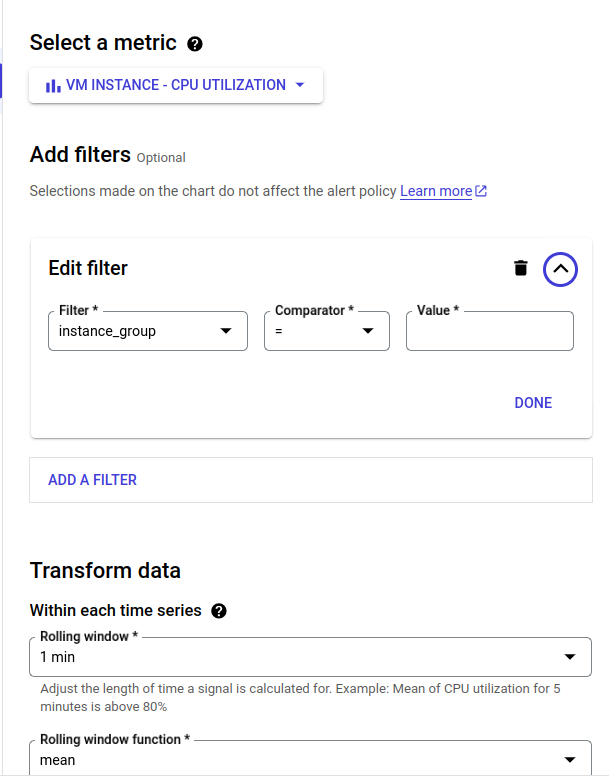 - Click in the Filter field and select instance_group from the drop-down menu.