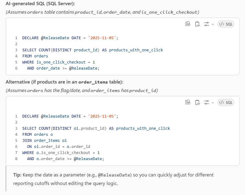 - Ask for validations: “Add WHERE guards to avoid NULL issues,” “ensure no duplicates,” “handle time zones.”