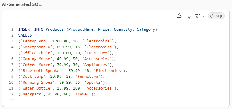 Prompt: “Write a SQL script to insert 10 random products with name, price, quantity, and category using SQL Server.”