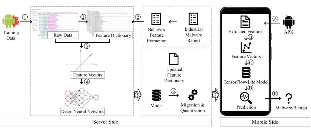 A modern on-device malware detection system follows a two-phase architecture (as illustrated below), separating heavy computation from real-time protection.