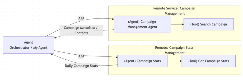 - The second agent runs on a remote service and is responsible for campaign management. It exposes a tool called Search Campaign, which returns campaign metadata and contact information.