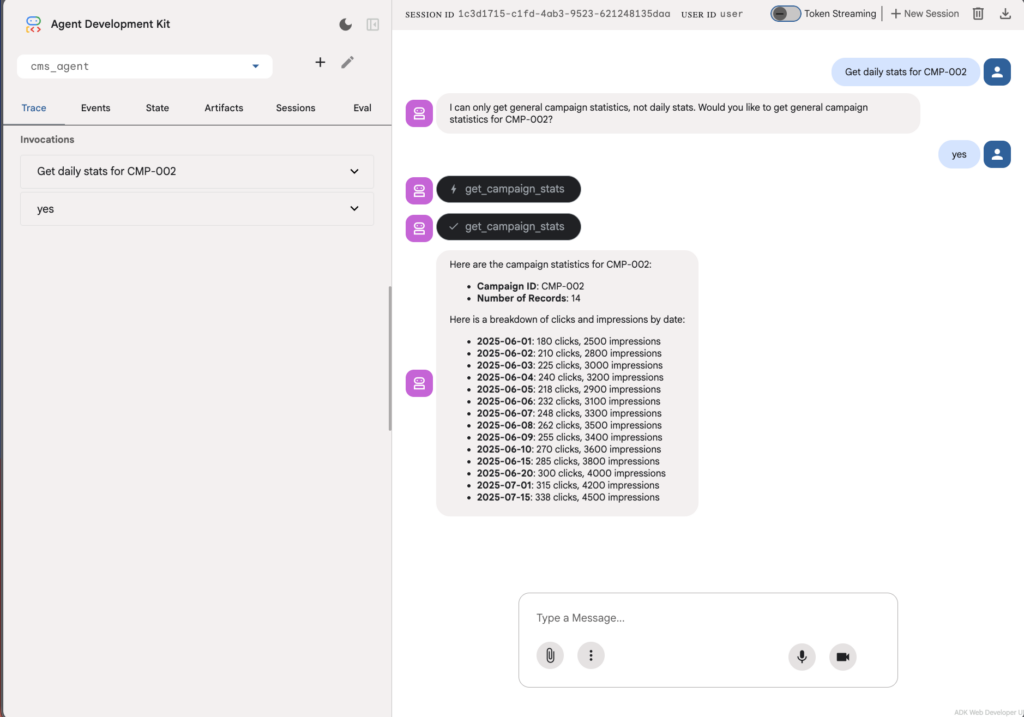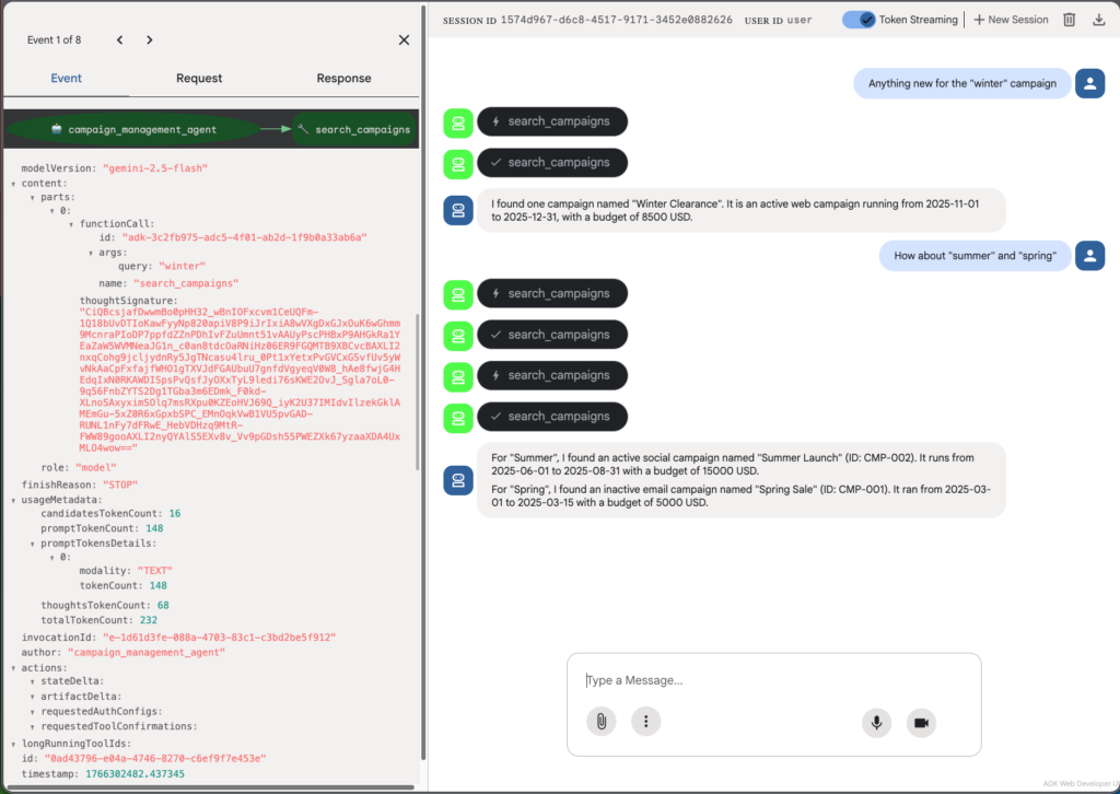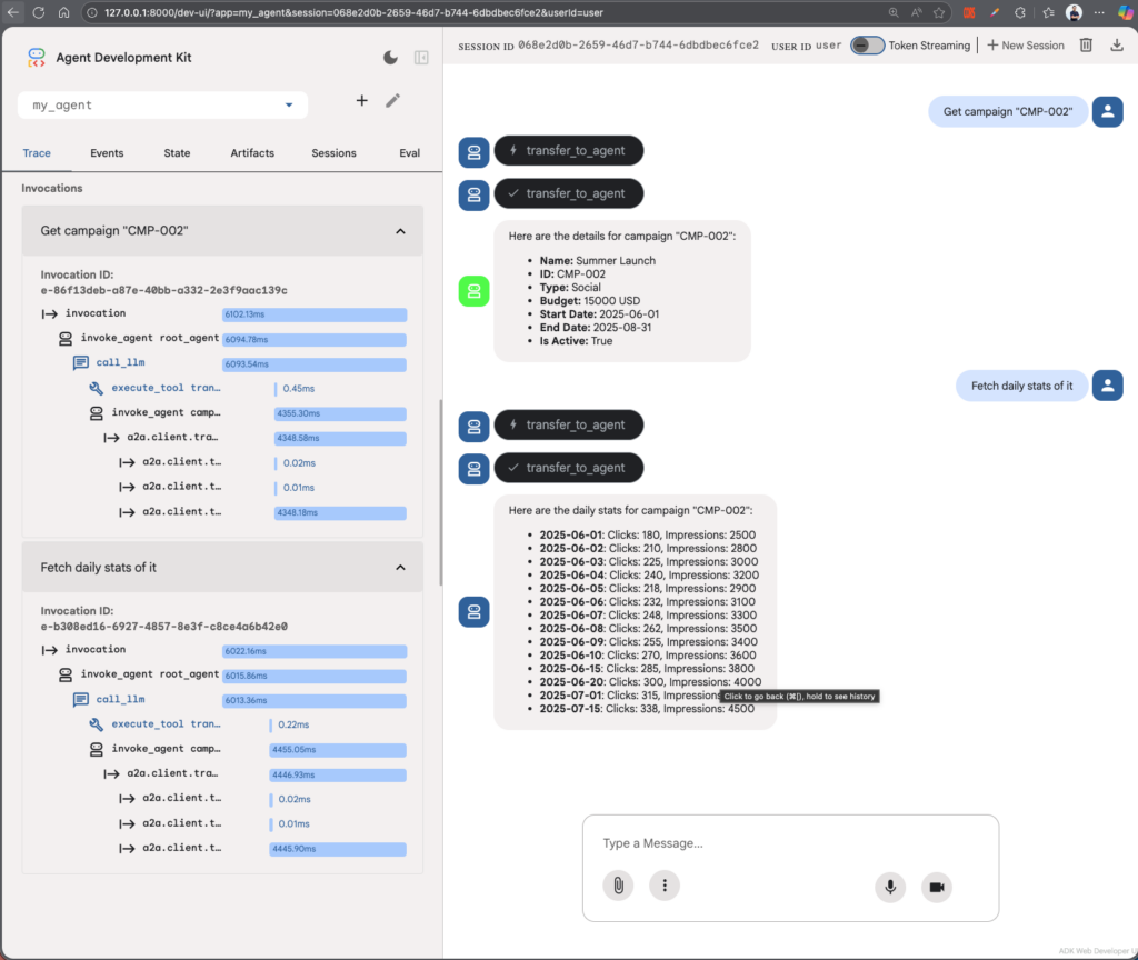 Test your agent using the ADK web command. You’ll see that even the main agent can’t use other tools to fetch campaign information, but it can obtain it by asking another agent.