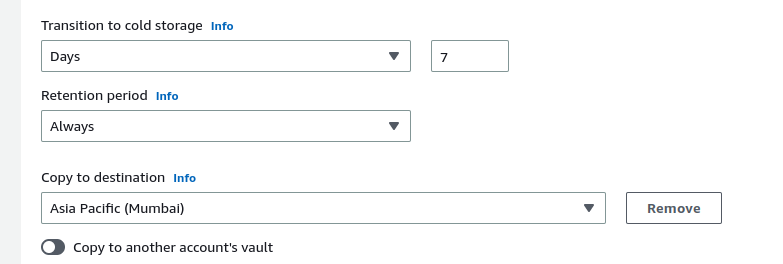 - AWS Backup allows you to define retention rules to determine how long to retain your backups.