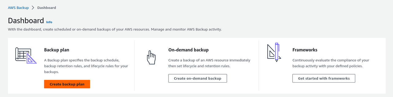 - AWS Backup provides a centralized console and API to manage backups across multiple AWS services.