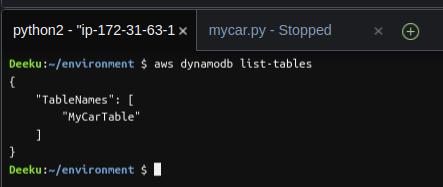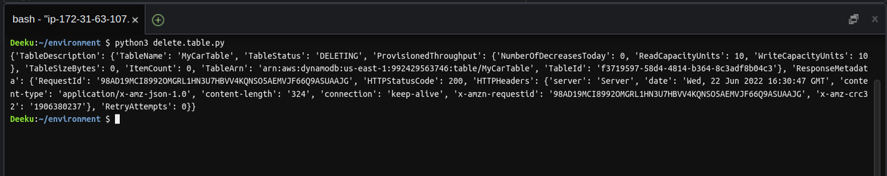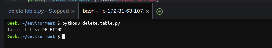 Last but not least follow the same steps above to create a delete.table.py file. Once your file has been create, the table can now be delete by entering the command below: