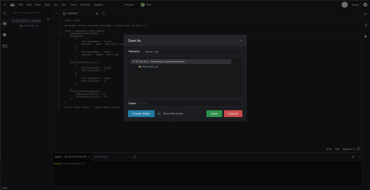 A few things to bear in mind would be to associate your table with the region you are located in, as well as to append the “.py” at the end of your filename in order for Cloud9 to be able to read the python scripts in your file.