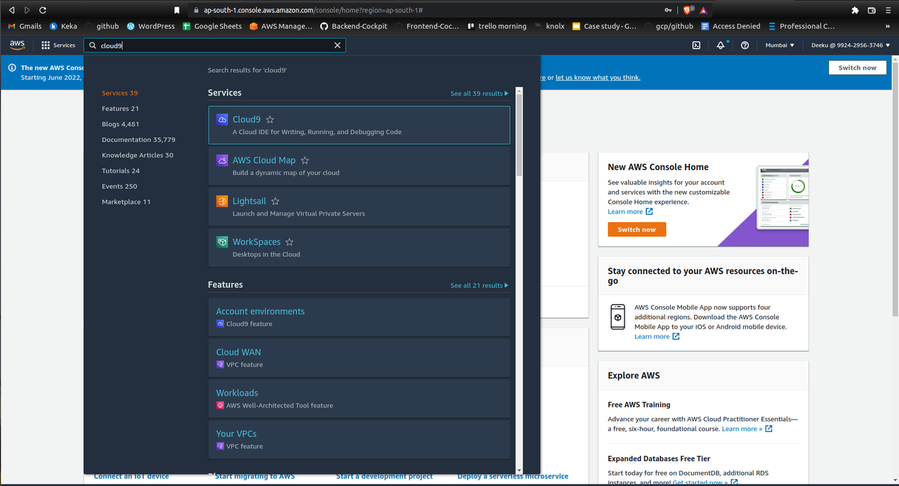 Setting up our cloud9 environment is the initial stage in this . Go to the search bar in the AWS console and enter “Cloud9” there. In the “Developer Tools” section under services, you may also find Cloud9.