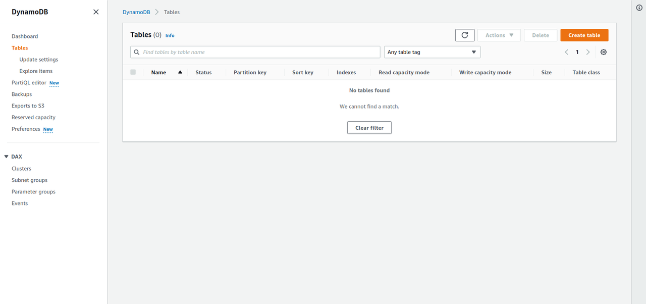 1. In the AWS management console, click on “Database”, select “DynamoDB”, and click on “Tables” to view our tables. Or simply by typing “DynamoDB” in the search bar.