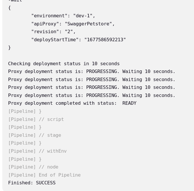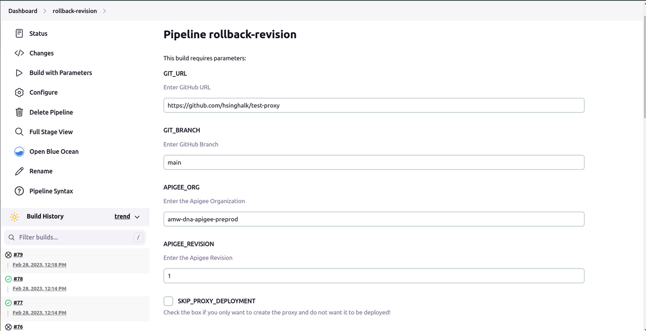 The above prerequisites will append an apigee revision in a job of deployment proxy Jenkinsfile whenever a deployment of proxy is done to find latest stable and unstable revision of proxy according to the name of the proxy in case of rollback.