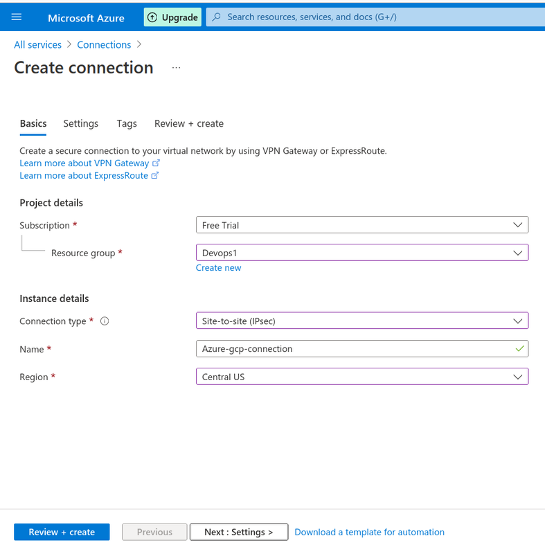 - create a site-to-site VPN connection between azure and gcp by selecting connection type.(Your on-premises network is linked to an Azure virtual network via an IPsec/IKE (IKEv1 or IKEv2) VPN tunnel using a site-to-site VPN gateway connection.)