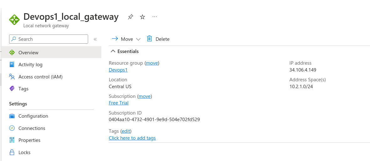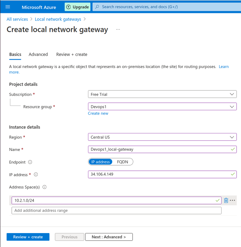 - The address spaces for the network that this local network represents are referred to as address spaces. Multiple address space ranges can be added. Make sure the ranges you provide here do not cross over with the ranges of any other networks you intend to connect to.here i have specified the ip of gcp subnet where i am making connection.