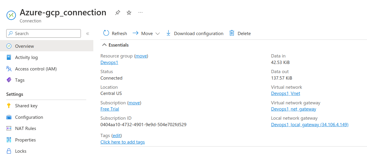 finally verify the connection of your vpn by checking the status .as we can see here the status is connected that means we have successfully connected with across cloud network.