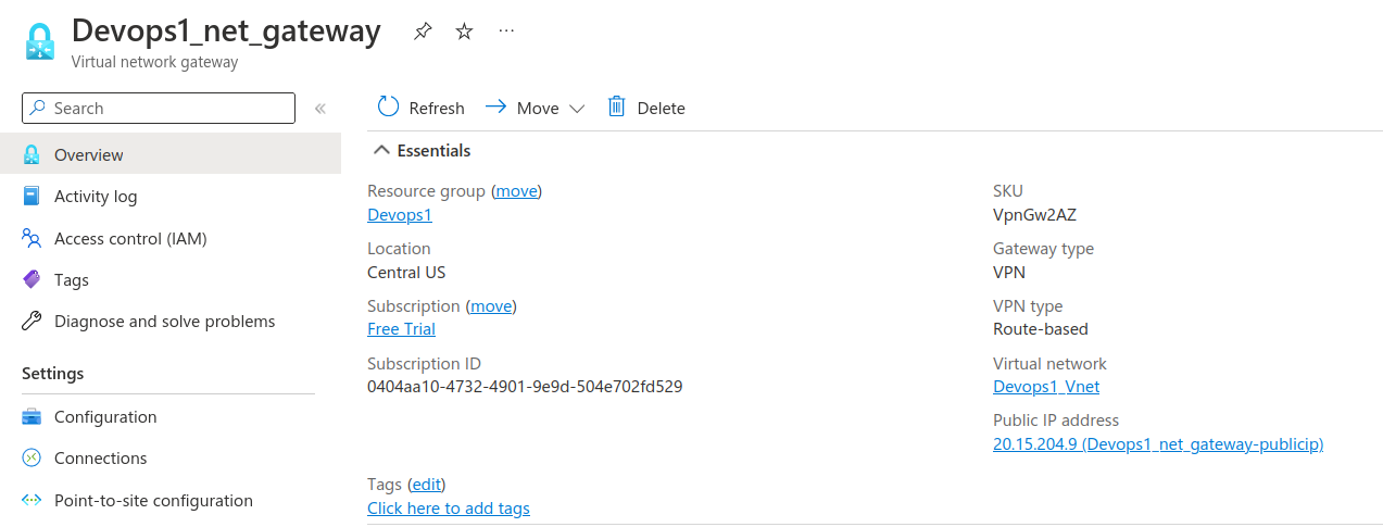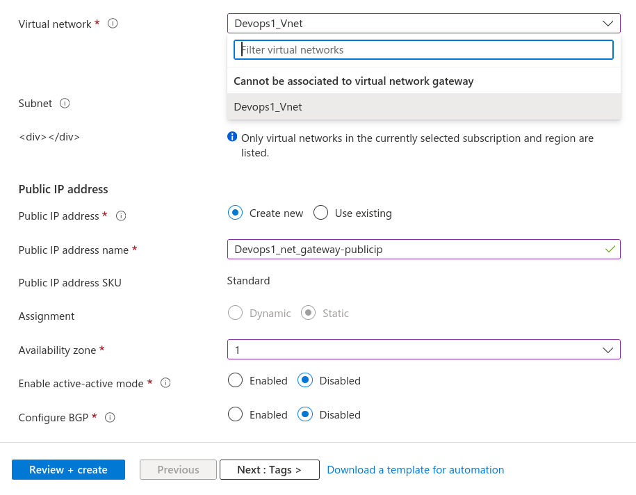 2. specify the name of your vitual network gateway (eg. Devops1_net_gateway )