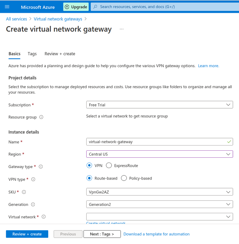 Creating vitual network gateway