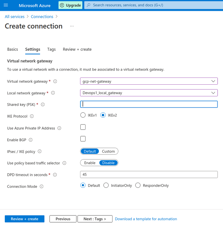 - IP address :This public IP address belongs to the VPN device that you want the Azure VPN gateway to connect to.i have given the ip of my gcp vpn gatway as i am trying to make connection between azure and gcp .