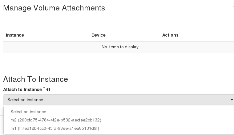 • In the Manage Volume Attachments, select an instance.